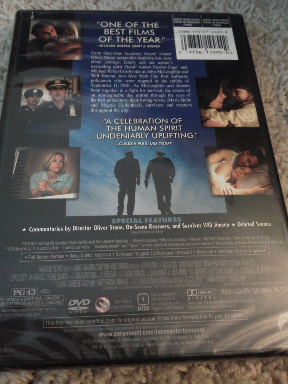 Nothing demonstrates the impact more of the events of September 11th than the resulting movie and tv productions. The highest profile example was World Trade Center, released in 2006 and directed by Oliver Stone. It stars Nicolas Cage, Maria Bello, Michael Peña, Maggie Gyllenhaal and Michael Shannon. World Trade Center is one of two films released in 2006 involving the 9/11 disaster, the other being United 93. For more info about the film's story, visit here.Here is the DVD. Like many other examples from my collection, here is a clear cut example of how 9/11 influenced all forms of material culture. Also, like many other items, the movie included a donation component. Here is the release: